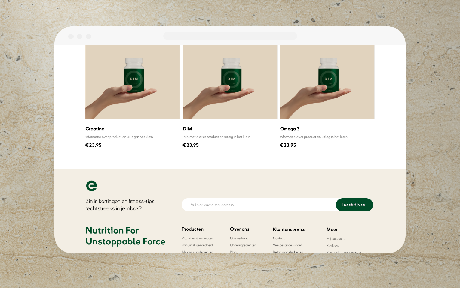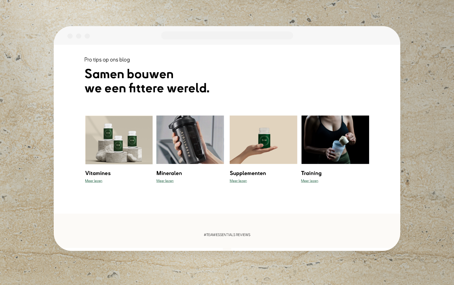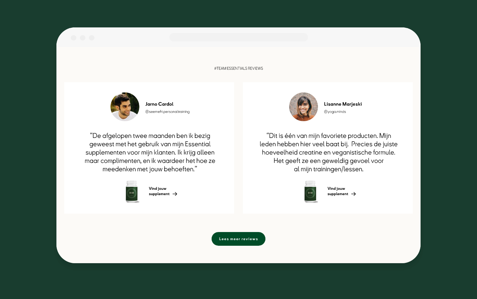 Een merk dat rust en kwaliteit uitstraalt, tot in het kleinste detail. De donkergroene verpakkingslijn geeft Essentials een krachtige, onderscheidende uitstraling binnen de sport- en healthmarkt. In combinatie met heldere branding, sterke fotografie en een doelgerichte B2B-website staat er nu een merk dat professioneel oogt én strategisch klopt.